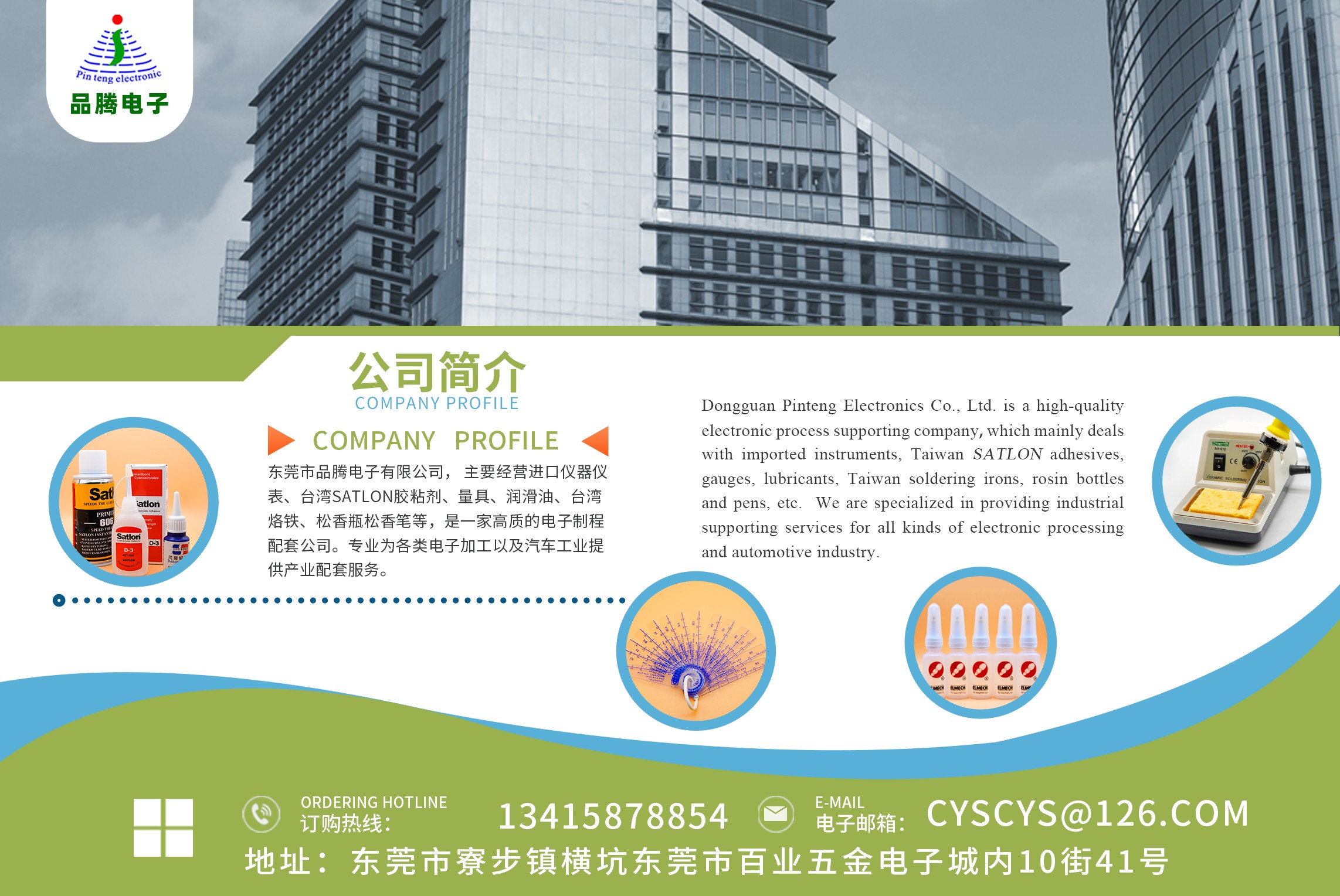東莞市品騰電子有限公司, 主要經(jīng)營(yíng)進(jìn)口儀器儀表、臺(tái)灣Satlon膠粘劑、量具、潤(rùn)滑油、臺(tái)灣烙鐵、松香瓶松香筆等,是一家高質(zhì)的電子制程配套公司。專業(yè)為各類電子加工業(yè)以及汽車工業(yè)提供產(chǎn)業(yè)配套服務(wù)。